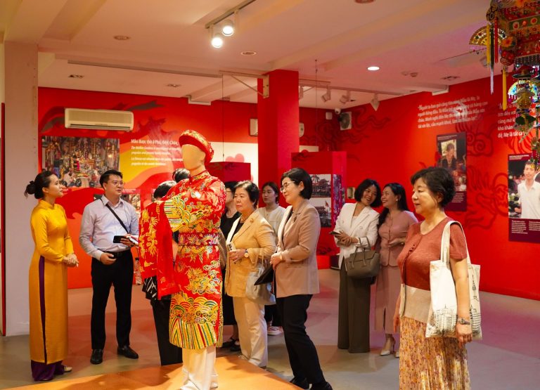 • Visitors begin their journey with a short film capturing scenes from the “Mother Goddess: Pure Heart – Beauty – Joy” exhibition at the Vietnamese Women’s Museum.