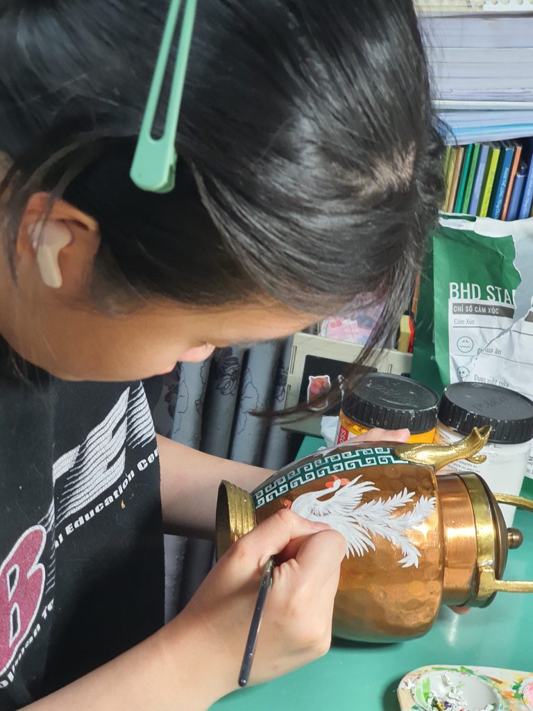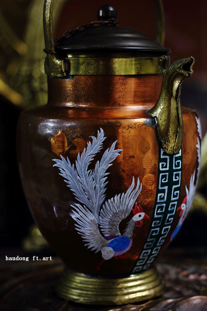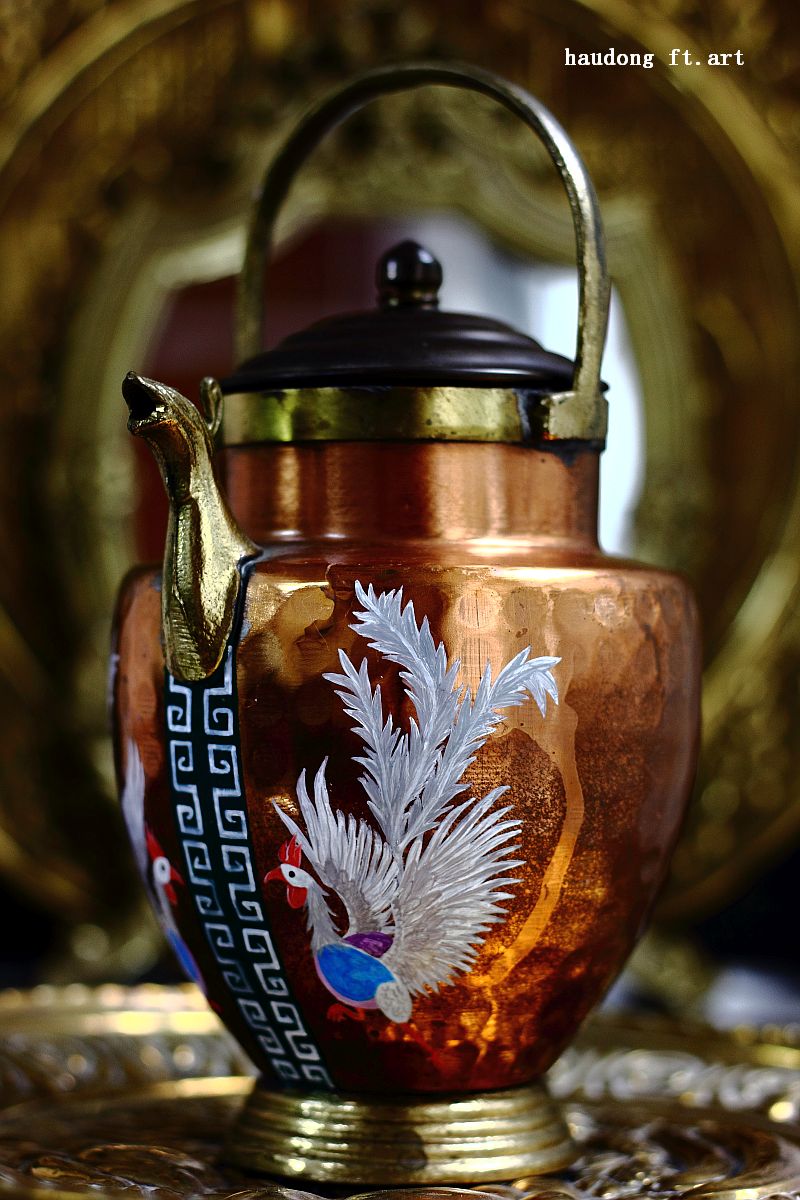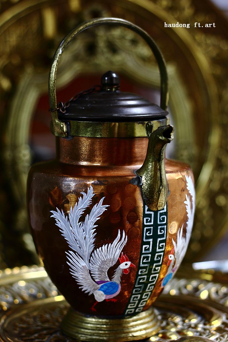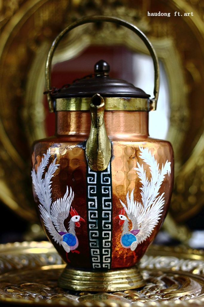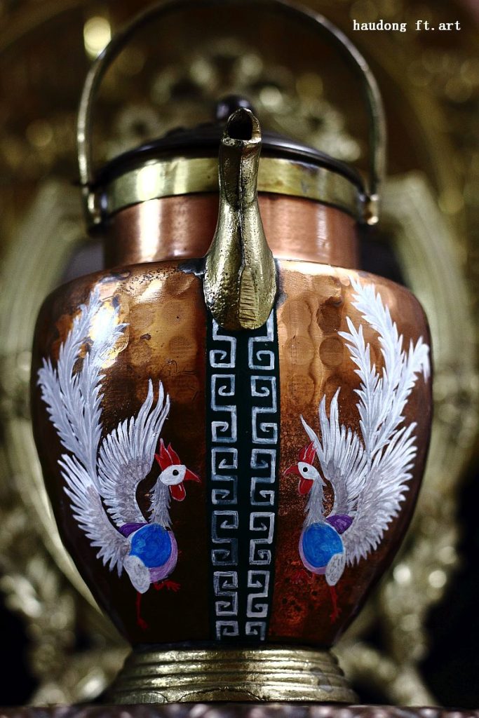 This exquisite piece transforms a traditional red copper coffee pot into a canvas of spiritual symbolism and cultural heritage. Rendered in vibrant acrylic, the design features a pair of phoenixes—mythical birds emblematic of renewal, purity, and divine power in Vietnamese folklore. These phoenix motifs are directly inspired by the ornamental patterns traditionally found on the ceremonial costumes of goddesses in Vietnam’s indigenous Mother Goddess worship (Đạo Mẫu).