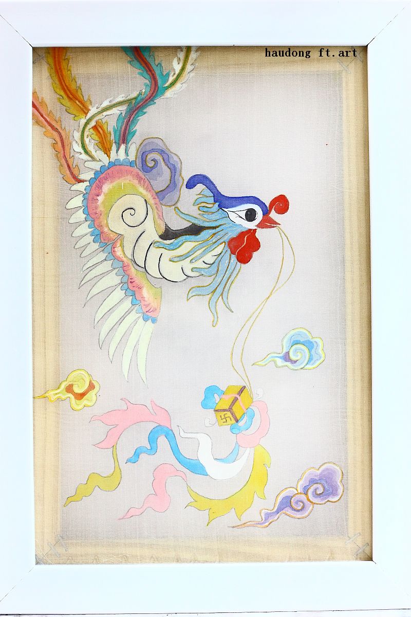 This artwork depicts a stylized phoenix, delicately rendered in gouache on silk, a motif deeply rooted in Vietnamese cultural and spiritual traditions. With flowing lines and a luminous palette, the phoenix radiates elegance, vitality, and transcendence. Its feathers dissolve into multicolored clouds and auspicious symbols, while the silk surface enhances the ethereal quality, as if the creature were suspended between the earthly and celestial realms.
